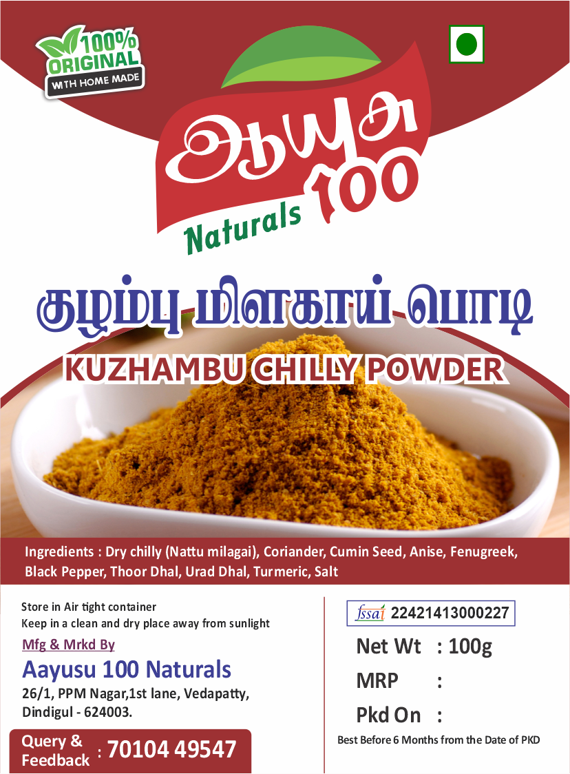 Made from high-quality ingredients with no artificial additives, our Kuzhambu Chilli Powder is essential for anyone looking to cook authentic South Indian flavors at home.