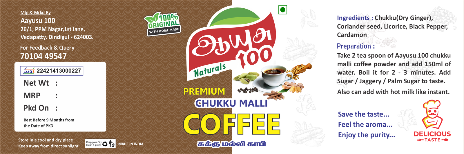 Relax and recharge with our Sukku Malli Coffee, a traditional herbal blend combining dry ginger and coriander. This comforting coffee is known to soothe digestion, boost immunity, and energize without caffeine.